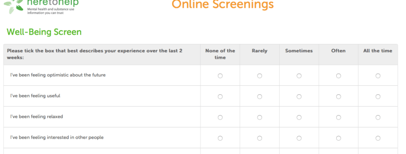HeretoHelp.bc.ca has screening tests for various mental health problems, and a well-being screening test. Check it out on HereToHelp.bc.ca.